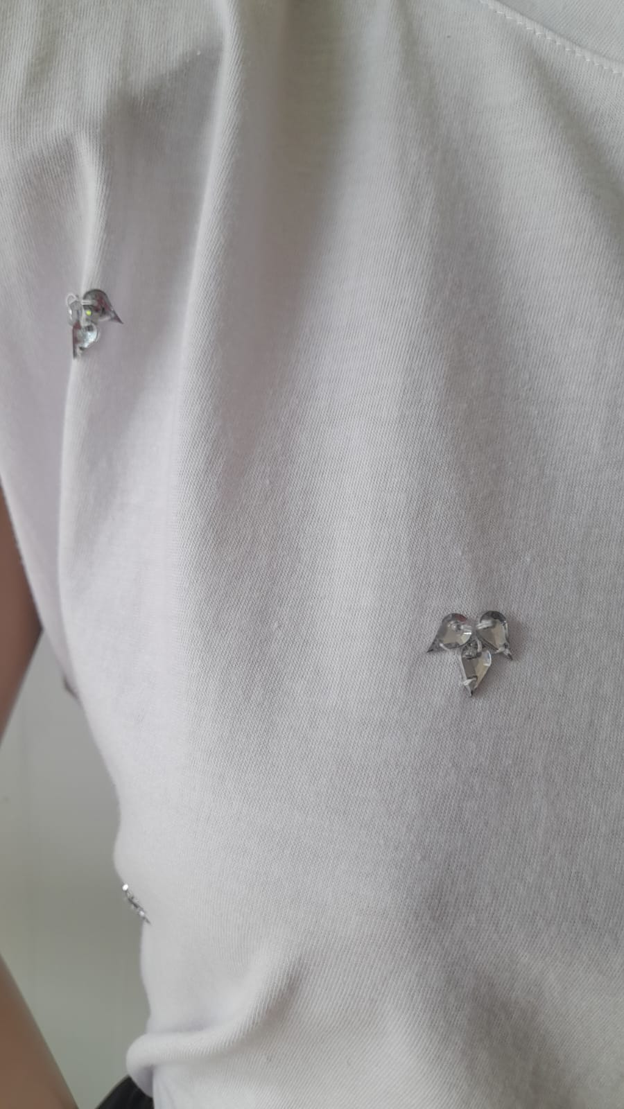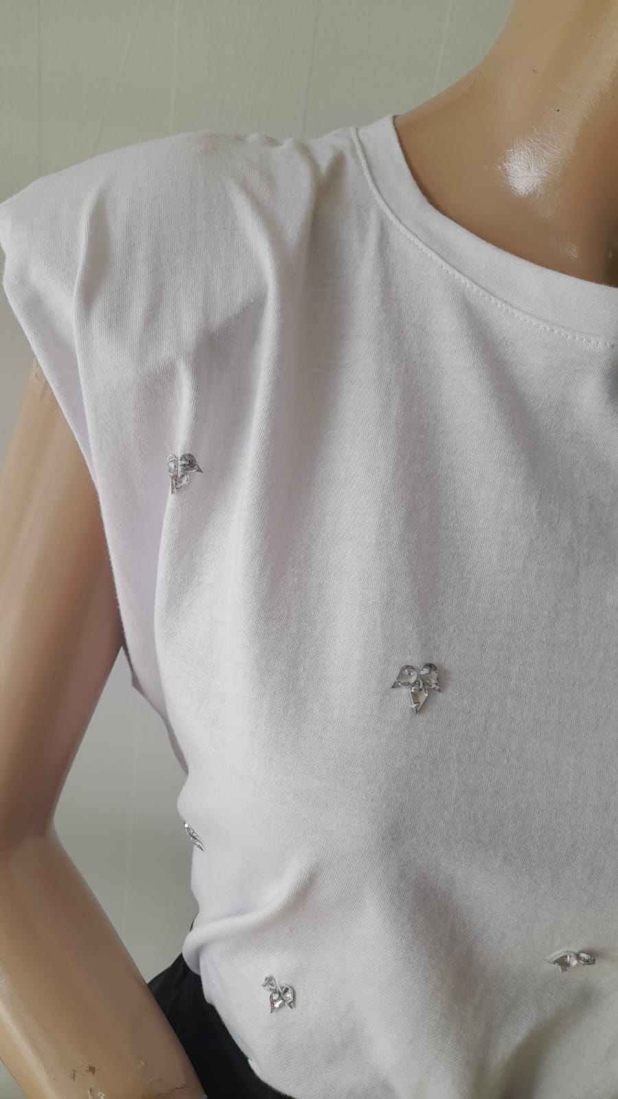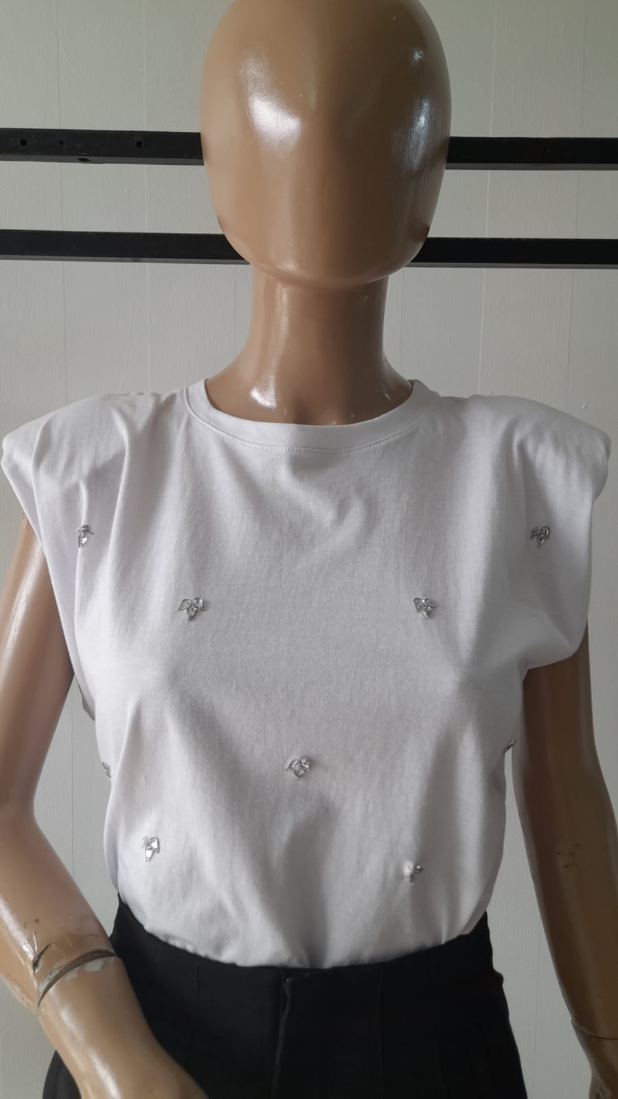 Remera algodón sin mangas con hombreras bordada con stras. Disponible en blanco talle L